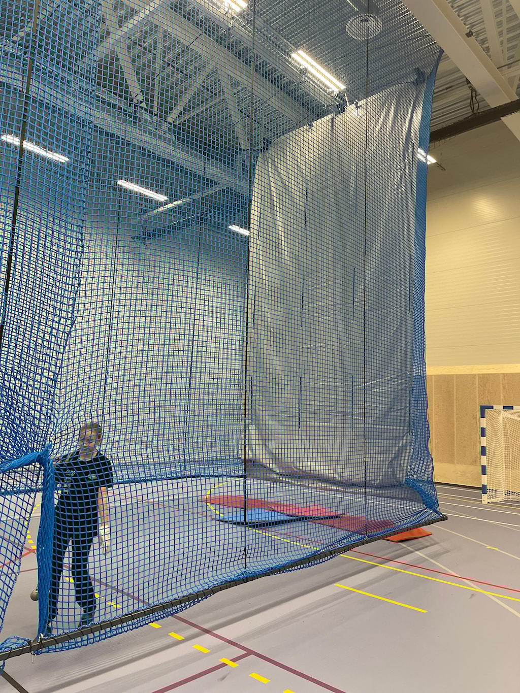 Snøgg Friidrett har fått kastbur i Helse Arena. Kasterne startet sin innetrening mandag, og kommer til å ta dette hev-/senk kastburet flittig i bruk fremeover.